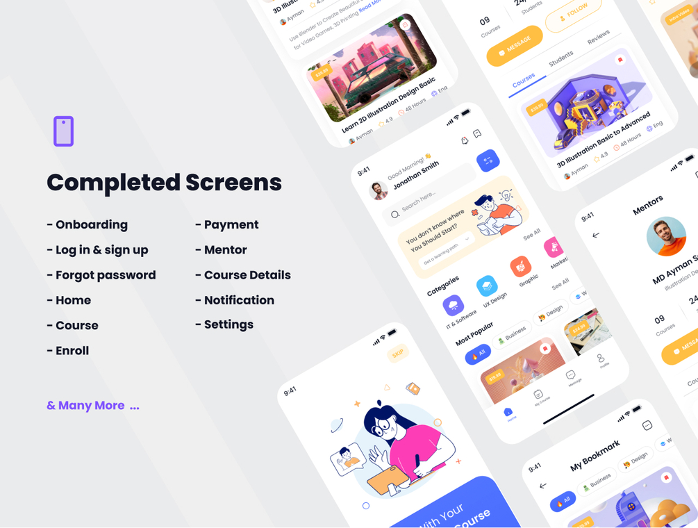 Learnsi - Education Mobile App UI Kit consisting of 150+ pixel-perfect screens and easy to use in Figma.The kit is easy to fully customize to your liking and it leverages all Figma features, including global color, font styles, dynamic components & variants. Available in Light & Dark mode. Develop your mobile app with these neat, clean, modern and outstanding design screens.