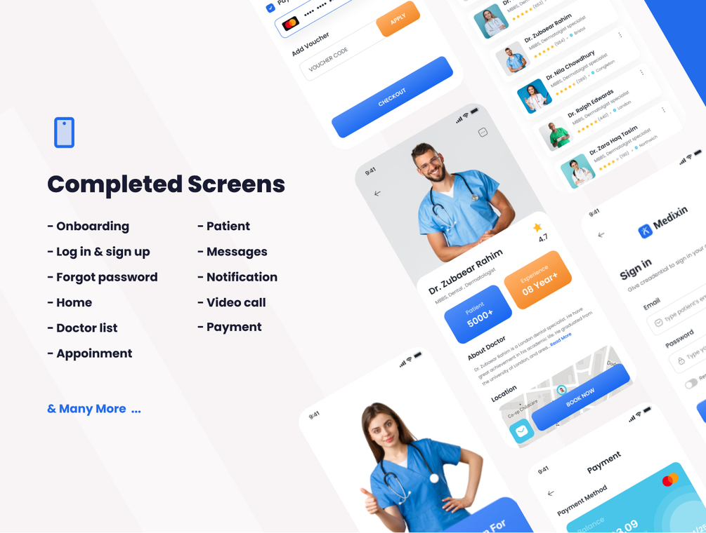 Medixin - Online Medical App UI Kit consisting of 30+ pixel-perfect screens and easy to use in Figma.The kit is easy to fully customize to your liking and it leverages all Figma features, including global color, font styles, dynamic components & variants. Available in Light & Dark mode. Develop your mobile app with these neat, clean, modern and outstanding design screens.